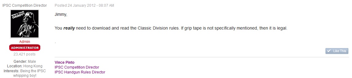 Por otro lado se permite tunear demasiado las pistolas, yo mismo la tengo puesta con todo lo permisible y no me parece una pistola clasic. Un fanel de hasta 5 mm de largo y 34-35 de anchura creo que es, boton sobre dimensionado de retenida de cargador, punto de fibra, aletas sobredimensionadas, cachas con rebajes, etc... Creo que pierde la esencia de clasic y es un mini standard limitado sin mas.