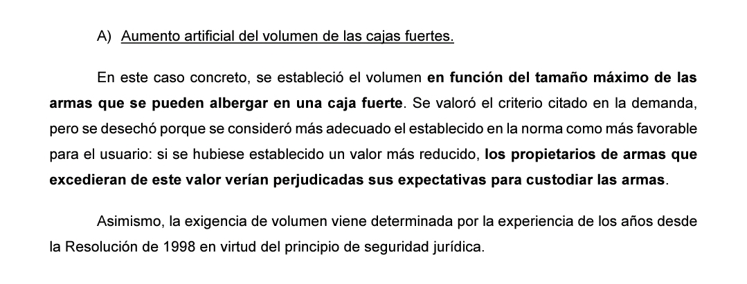 Por ello decimos que la norma emplea un concepto (el litro) que es propio del sector de fabricantes de cajas fuertes pero ajeno e inútil para el almacenamiento de armas, y ello indica que la redacción del art. 3 de la Resolución impugnada esconde intereses INDUSTRIALES en aumentar artificialmente la cabida de las cajas fuertes. Esta conclusión se ve reforzada porque se aparta notoriamente del criterio del TODOS los países de la Unión Europea, dado que ninguno de ellos ha regulado la cabida de las cajas fuertes, dejando que esa CUESTIÓN DE HECHO sea probada caso por caso en los procedimientos de autorización de armas.