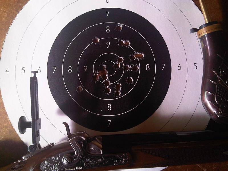 Trece tiros, el primero un 7 a las dos, despues el 8 a las tres y despues el 9 a las tres y el resto no han ido mal a excepcion de el 6 que es el resultsdo de una mala carga devido a la estrechez del cuello del embudo, se a obstruido la polvora y he hechado la semola encima y al sacudir se ha mezclado y ha salido un tiro raro. Ya lo he solucionado agrandando el cuello