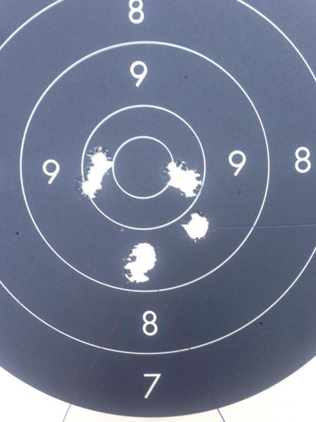 Un solo disparo malo, el ocho a la derecha que no supe el porqué......... a partir del cuarto disparo dejé de poder ver los impactos por el catalejo por una brusca caída de la luz al ponerse el cielo mas negro que el sobaco de Kunta Kinte, pero como la cosa no iba del todo mal me dediqué a hacer los deberes con la anilla y el blanco, y al acabar me encontré con un sabroso 97