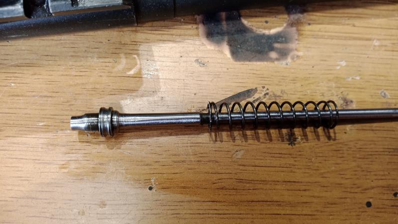 Lo que hay que hacer es un muelle de martillo percutor nuevo, pero no tan fuerte como el de origen, que creo recordar que esta hecho de alambre de acero de 1,5mm, y el que yo he hecho es de 1mm (tiene que ser alambre de acero al carbono, yo lo he comprado en una tienda de maquetismo). Esta parte es puramente artesanal, tendrás que ingeniartelas para replicar el muelle, lo mas complicado es hacer las espirales, yo las hice con dos tubos que entra uno dentro de otro y en uno de ellos una muesca donde meter el alambre y darle vueltas para hacer las espiras, pero no me pidas muchos detalles que hace años ya de aquello. Lo que si es necesario es darle un tratamiento térmico al muelle nuevo, muy fácil, hay que calentarlo a 250°C, yo lo hice metido en un tubo de cartón y con una pistola de calor y un termómetro que llegue a esa temperatura lo tienes enseguida.
