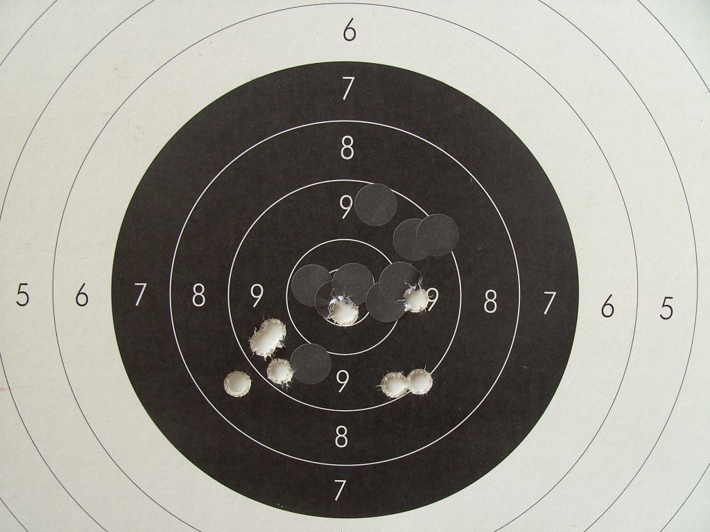 He utilizado los proyectiles de seis bandas que no han ido mal, pero tengo la impresión de que no agrupan como los de siete. Realmente no hay ningún disparo malo (salvo posiblemente el 9 alto que fue el segundo disparo). Habrá que repetir la semana que viene con esta combinación a ver si agrupa un poco mas.