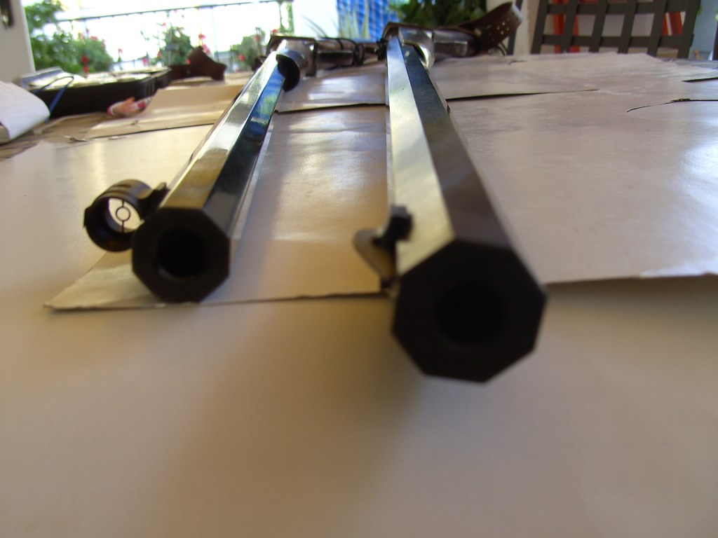 Como puede verse en las fotos, el cañon del modelo de Izquierdo es aparte de unos centímetros más largo, bastante mas grueso. De hecho la diferencia de peso de un arma a otra es de un kilo (4,85-5,85) por lo que ahora el peso del Sharp es igual o bastante similar al del Gibs.