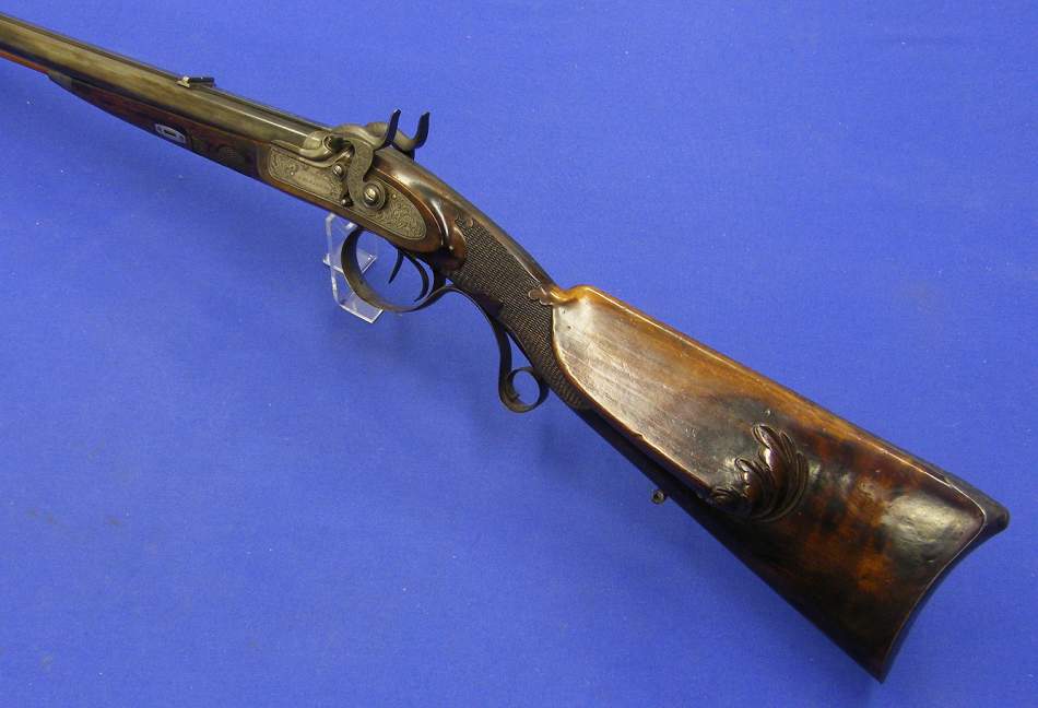 Un bello rifle aleman en percusion con doble cañon firmado por A.Dickoré in Giessen, calibre de 14 mm. y un largo de 117 cm.