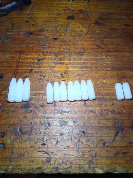 En la foto se ven puntas de nailon obtenida por extrusión de calibre 8,23 y longitud de 30mm como la original, también de 25mm y 20mm.