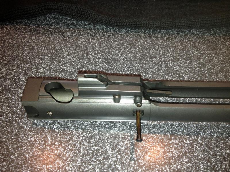 Detalle del porta cierre, se puede ver el seguro de la aguja, este es un avance muy importante ya que los ARs convencionales pueden tener un fallo llamado Slam Fire, que se produce cuando el cierre avanza y una aguja con excesiva holgura provoca un disparo accidental.