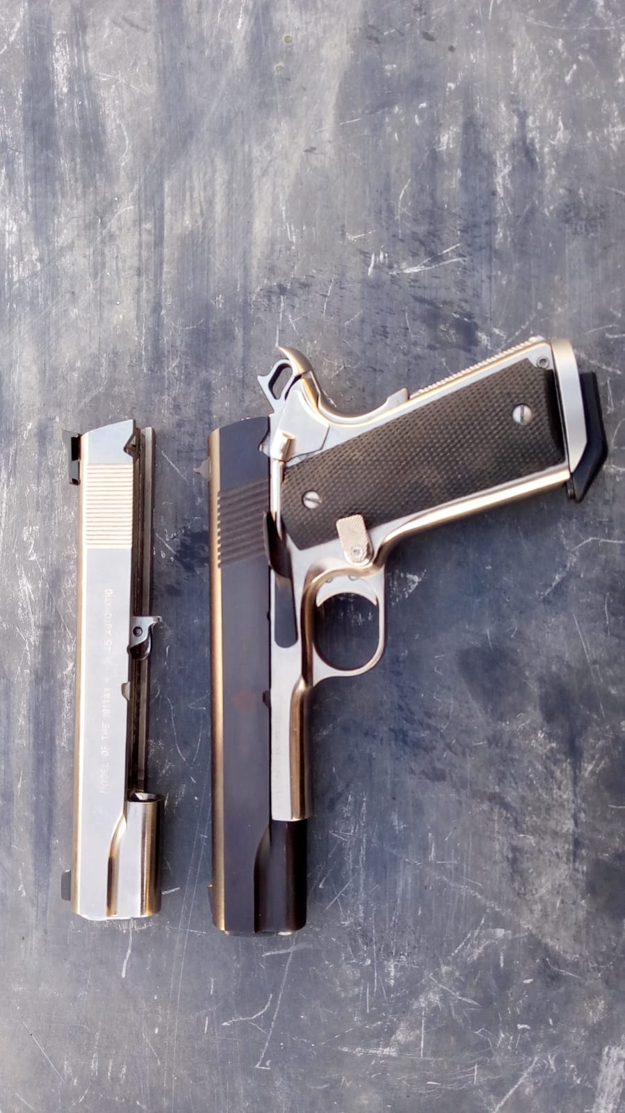 Mi Norinco 1911A1....................Originalmente .45acp, la corredera cromada y mi kit de conversion 9mm la corredera Azul. Super preciso y fiable con los dos calibres.