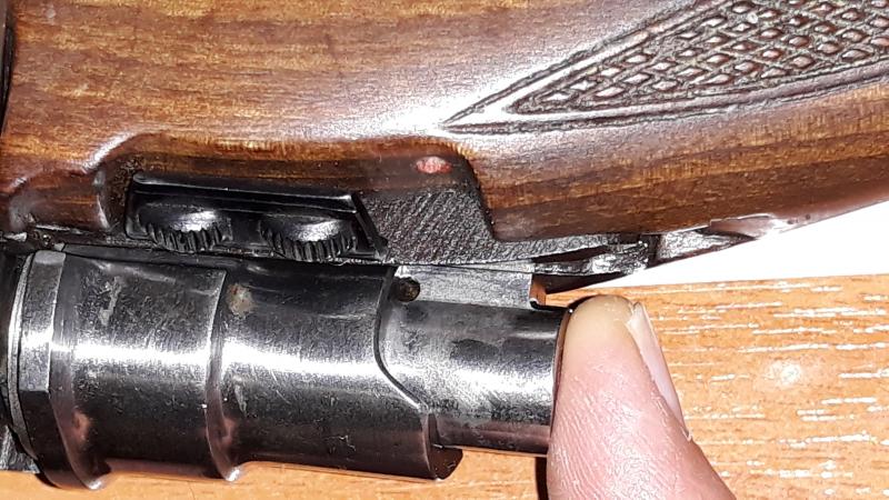 Si en esa posición presionamos con el dedo, foto 2, la cabeza de la aguja cede como 1 mm y queda tapado el agujerito, aunque sigue montada y se dispararía con normalidad