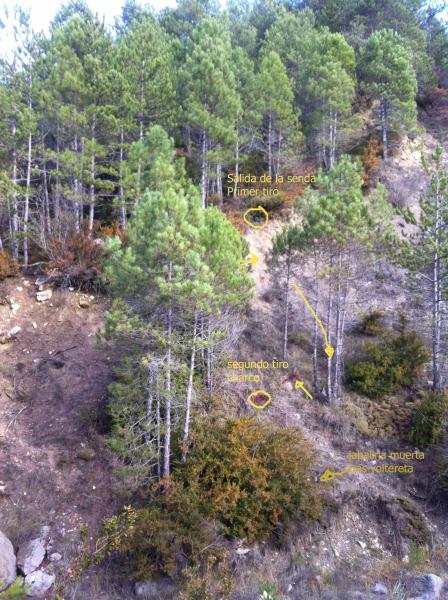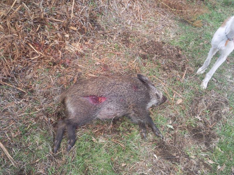 Asoma la jabalina, encaro y le meto el primer tiro al lado de la oreja, pero como seguia vivo a pesar del reguero de sangre que dejaba al bajar, por vicio, le pegué otro en el cogote (que le salió por el cuello), y dejó un charco de sangre justo en el lugar desde el que pego el bote mortal, tras el cual dos garreos y a dormir...