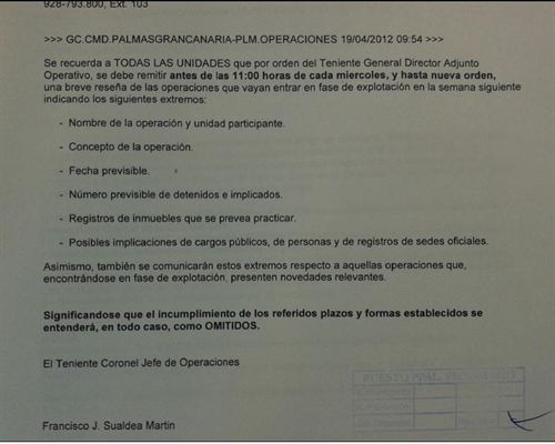 Oramas ha leído de forma íntegra esa circular --vigente desde el 19 de abril-- que, según ha dicho, le ha "sido facilitada". "Se recuerda a todas las unidades de que por orden del DAO se debe emitir antes de las 11 horas de las cada miércoles y hasta nueva orden una breve reseña de las operaciones que vayan a entrar en fase de explotación en la semana siguiente".