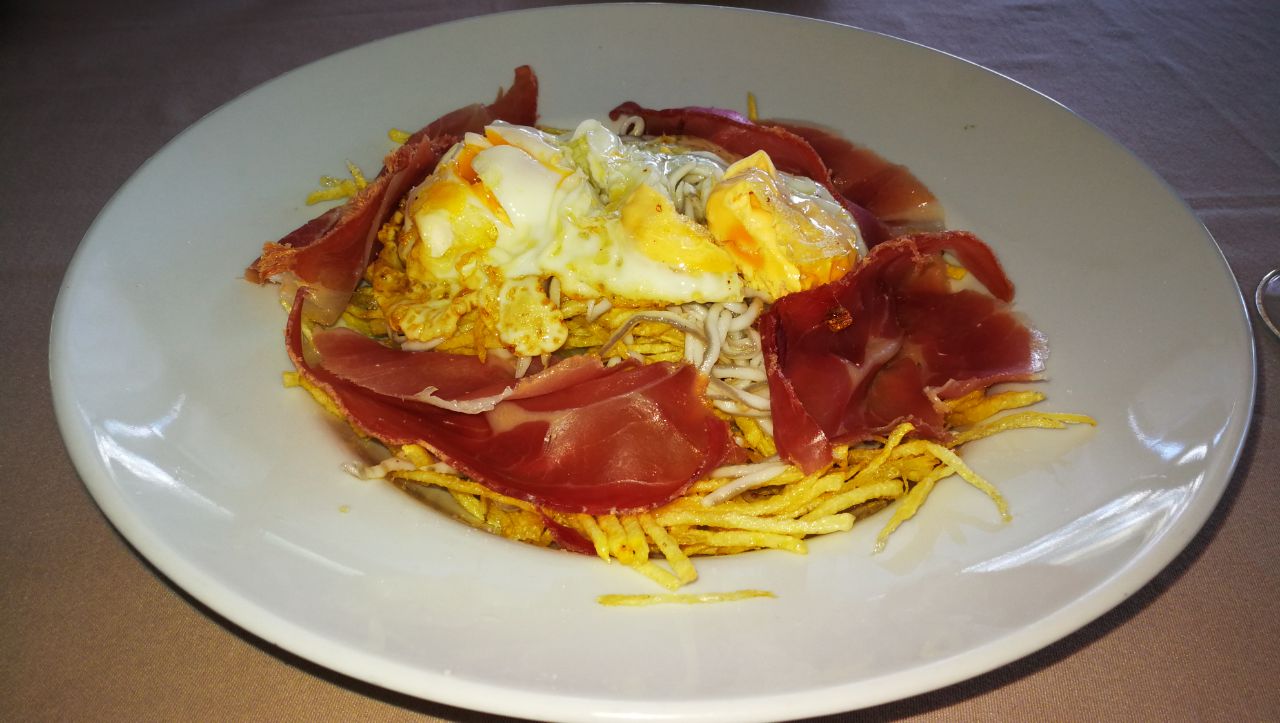 Huevos rotos, con patatas paja, gulas y jamón de Trevélez.