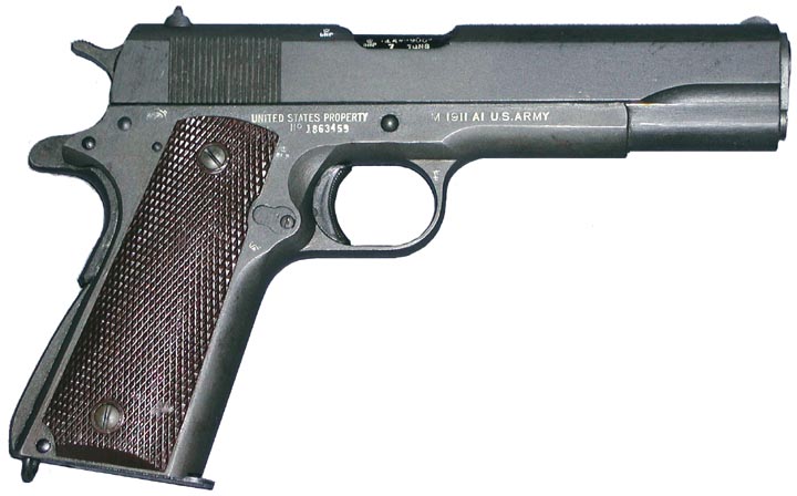 La primera y la que seguramente tiene casi todas las posibilidades de ser la de la imagen es la americana 1911 A1 en .45 ACP del "Lend Lease", nombre con el que se denominó al plan de ayuda que el gobierno del presidente Roosvelt brindó a los británicos tras el desastre de Dunkerque.