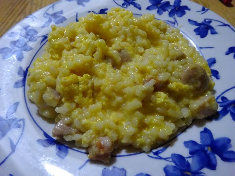Hoy arroz de Calasparra con lomo iberico fresco y salchichas de Frankfurt, regado todo ello con una Radler fresquita.