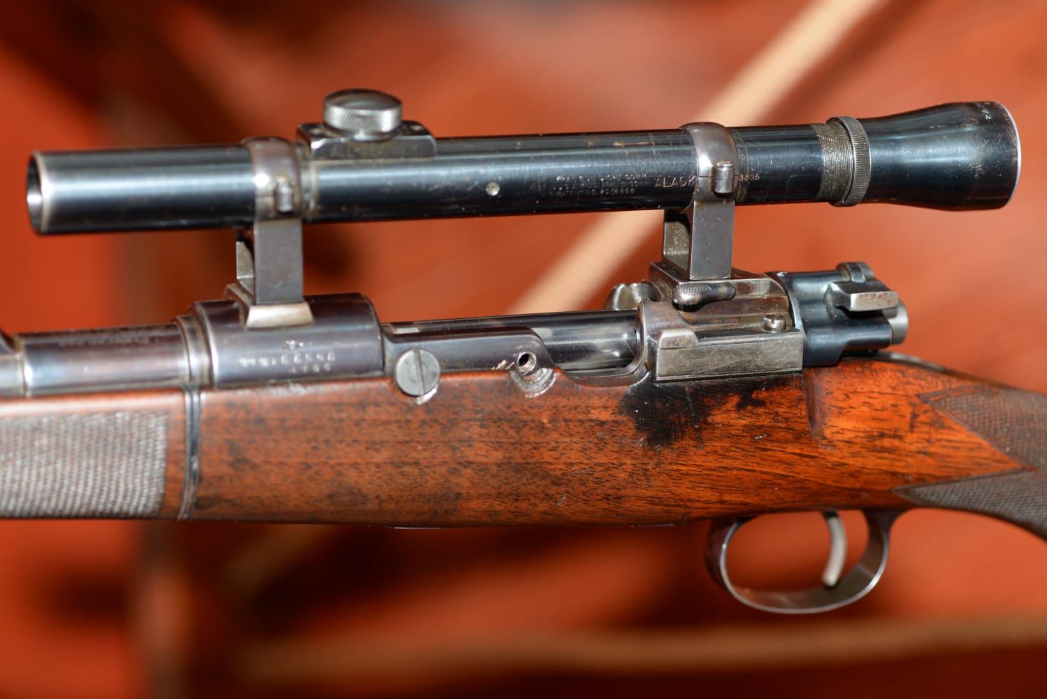 Os pongo unas fotos que he encontrado por la web de un 7x57 famoso. En realidad es el Rigby .275rigby de Karamojo Bell. Parece ser que él lo usaba con miras abiertas y uno de los propietarios posteriores le montó un visor Alaskan x2'5.