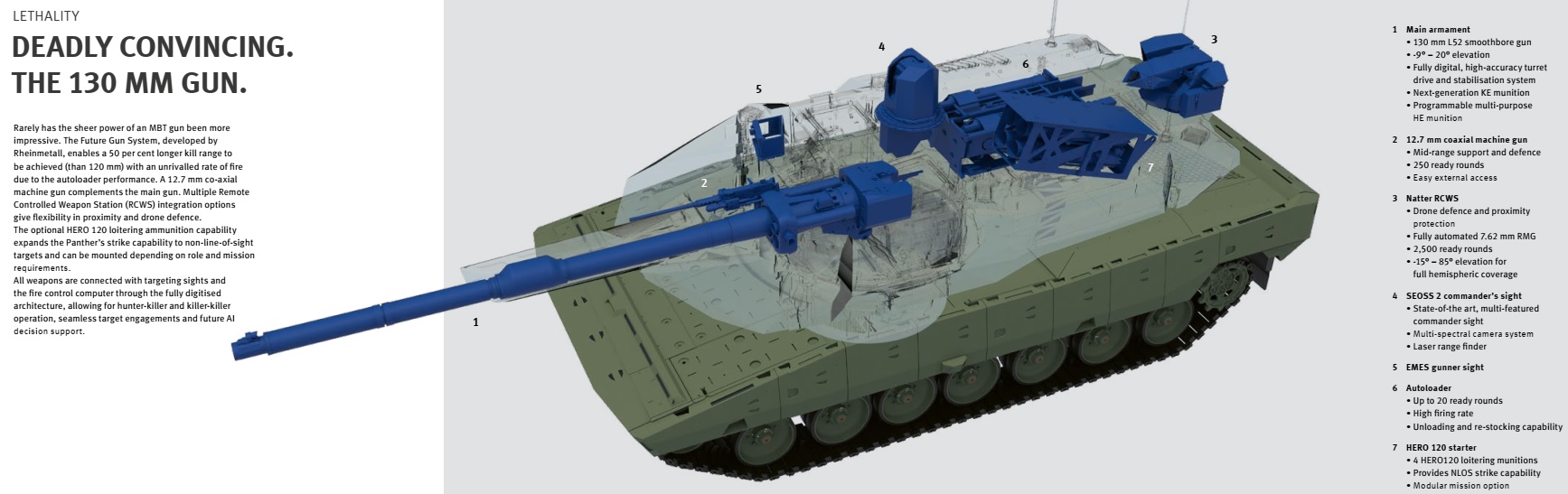 - Armamento: principal cañón Nexter 120mm NATO L52 de ánima lisa y 22 proyectiles en cargador automático