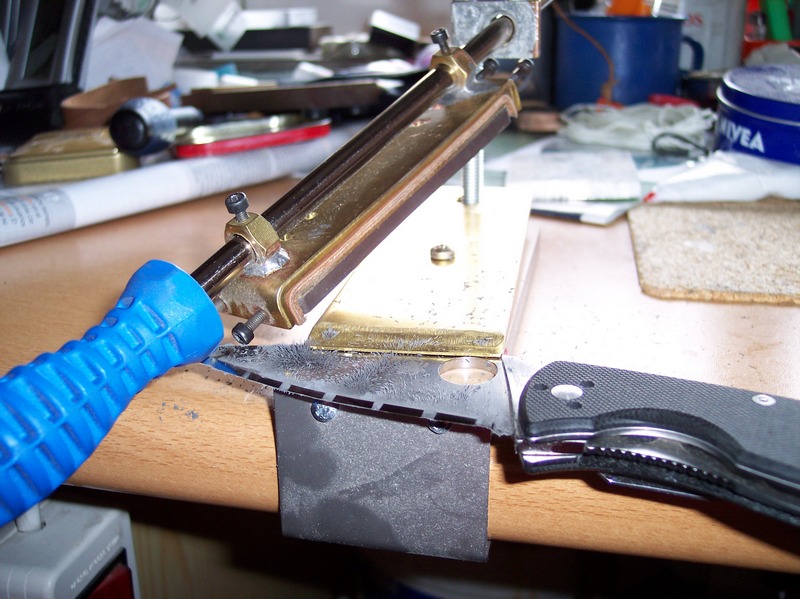 Efectivamente, el arte de afilarlos con este aparatito. La única diferencia entre utilizar este aparato o hacerlo "a mano" es que siempre mantienes el ángulo. El resto es lo mismo, pasadas y pasadas e ir sacando y comiendo rebaba.