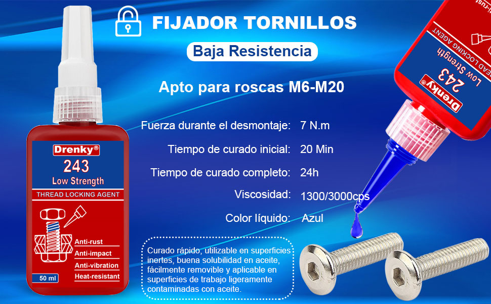 Los fijadores de roscas azules LOCTITE están diseñados para ser desmontables, lo que significa que el conjunto se puede aflojar con las mismas herramientas que empleaste para montarlo. Los fijadores de roscas azules no están diseñados para añadir resistencia a un conjunto, sino para evitar el autoaflojamiento debido a la vibración a la que está sometido el montaje.