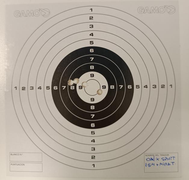 También estuve ajustando la mira que le había comprado a la Onix Sport, a 15 m. Conseguí una buena agrupación, naturalmente, no por mí, sino por la mira. Yo sigo siendo el mismo, me falta mucha práctica.
