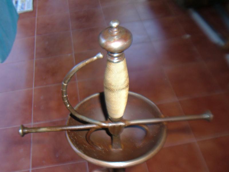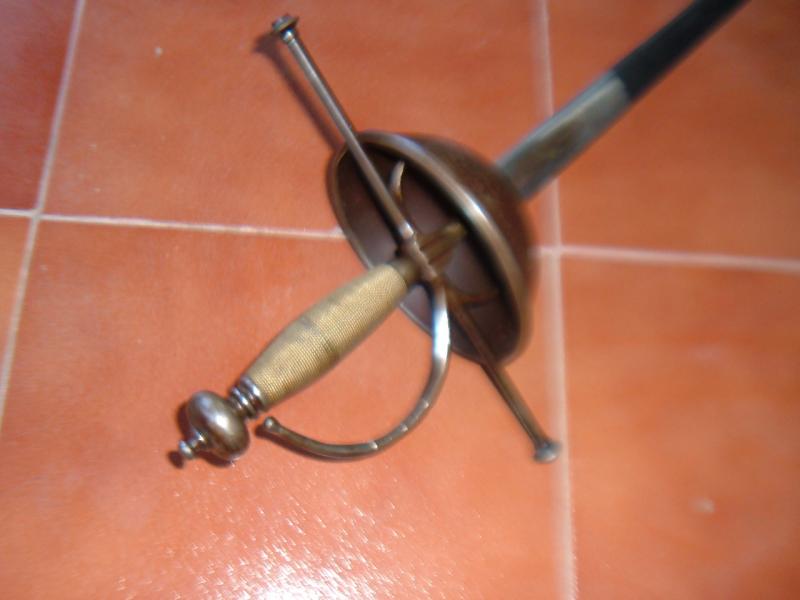 Lo concerniente a la cazoleta ,se realizo en un torno de entallar,;el pomo era de Jose Ballesteros gran maestro acicalador ,que lo fue de la Fabrica de Toledo,conocido coloquialmente como "Cebollita",muy famoso por la elaboracion de sus multiples encargos con cazoletas artisticamente caladas y sus hojas flamigeras.En lo que respecta a la empuñadura ,es madera de nogal forrada con torzal de laton.De las guarniciones tambien soy responsable,pudiendo haber quedado mucho mejor ,la falta de tiempo,la dependencia,y como no la prisa,hicieron el resto.Y con respecto a la funda ,aprovechando brocal y contera,hice la vaina.