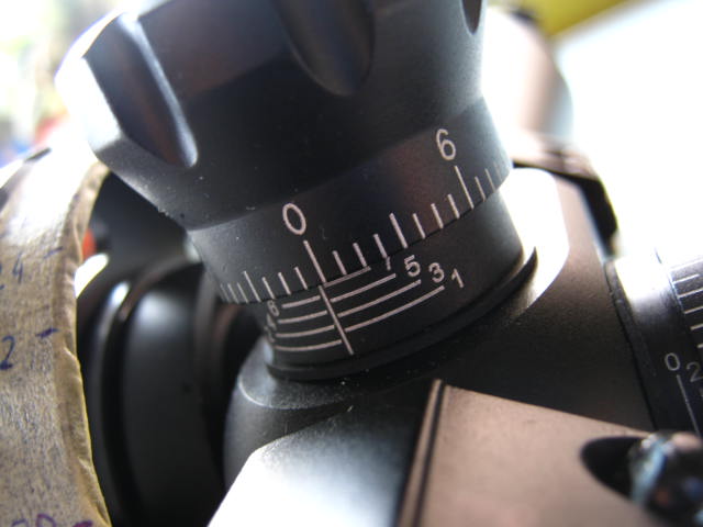 En la rueda misma, están las marcas de los cliks, y que empiezan con el nº0, ocho clicks de subdivisiónes (ya que el visor ofrece subdivisiones de 1/8 de moa) y llega al nº1, se repite esta secuencia hasta siete veces, de forma que se puede decir que CADA VUELTA DE RUEDAD DE LAS TORRETAS, corrigen siete moas.... y si queremos más seguimos con siguientes vueltas.
