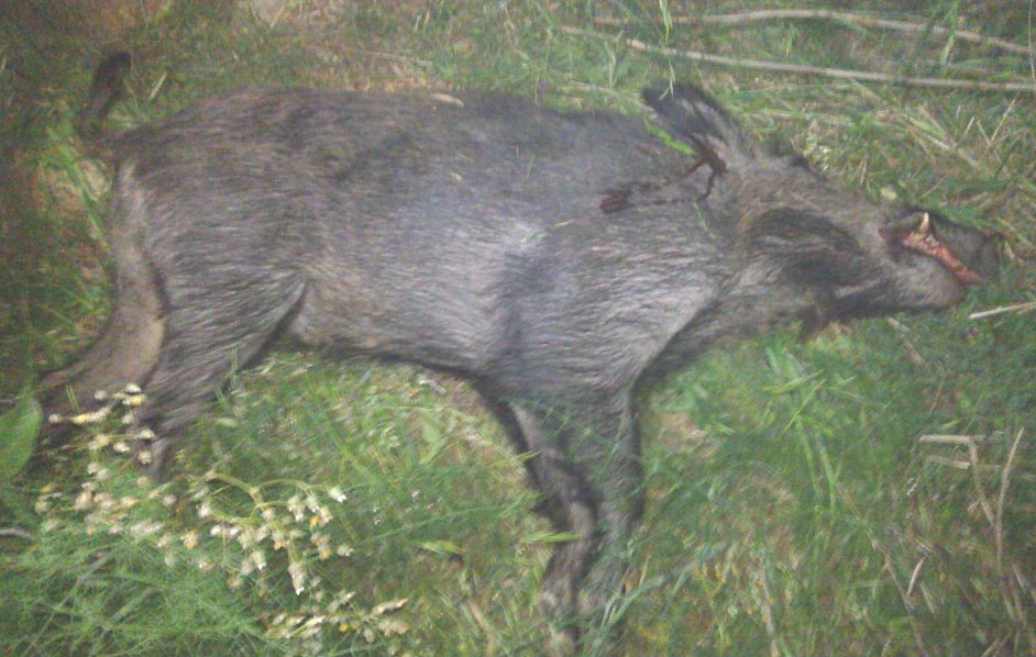 Voy oprimiendo muy lentamente el disparador puesto al pelo y...¡¡¡PPPOOOOOUUUUUUMMMMMMM!!!!!, mi BRNO .375 H&H Mágnum hace trizas el relativo silencio de la noche en el monte. Con el fulgor del disparo veo que le he pegado de lleno, justo un pelín más arriba del codillo, que era donde apunté. Lo vi caer a plomo con ese mismo resplandor del cañón. Cuando tocó su cuerpo el suelo ya estaba muerto. Ni temblores (estertores), ni quejidos ni, en definitiva, sufrimiento ni consciencia de lo que le había ocurrido.