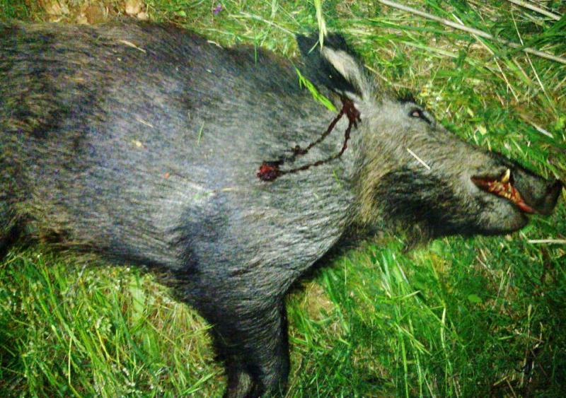 Cuando recorrí los aprox. 50 metros que me separaban de él, lo encontré en el lugar exacto donde recibió el disparo. Le miro la boca y descubro unos colmillos bien respetables y una hermosas amolederas.