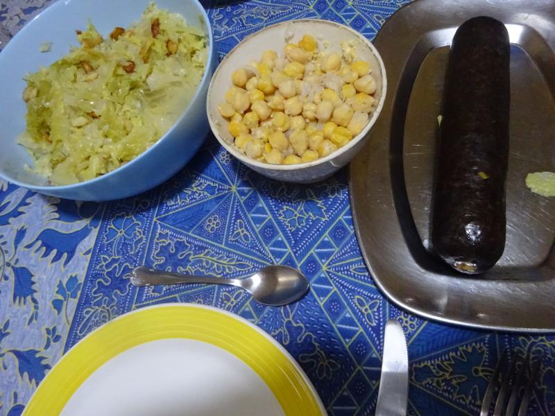 Hoy le he puesto a mi hermano col hervida con garbanzos y morcilla de arroz, de aperitivo unas gambas rojas que tenia congeladas.
