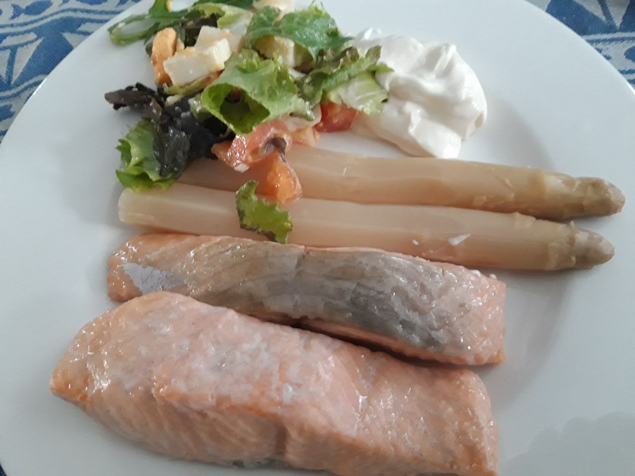 El plato de hoy : Salmón al vapor, con espárragos y ensalada.