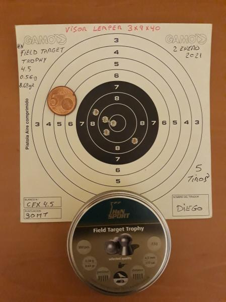Hola Fedello, hay van esas fotos, de las culpables de esas dianas, cometa fenix 400 compact 5.5 y gamo cfx royal 4.5, espero mejorar esas dianas el proximo dia que las saque de paseo, saludos. :birra^: