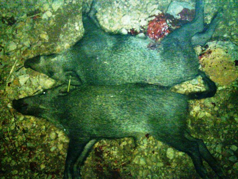 Tomo tranquilamente la linterna y el fusil; camino hasta el lugar y encuentro yacentes dos bonitos machos, uno junto al otro. En efecto, tal y como me lo propuse, el de delante tenía el orificio medio palmo tras el codillo y, el segundo, el pleno codillo. Aunque ambos murieron instantáneamente (no emitieron sonido alguno ni patearon, cosa que a mi me llena siempre de lástima y por la que siempre me apresuro a hacer un buen disparo de gracia), el de detrás se llevó la peor parte, pues recibió el proyectil Barnes TSX de 235 grains ya abierto. Creo que si hubiese habido 6 u 8 gorrinos en fila todos habrían sucumbido de igual modo.