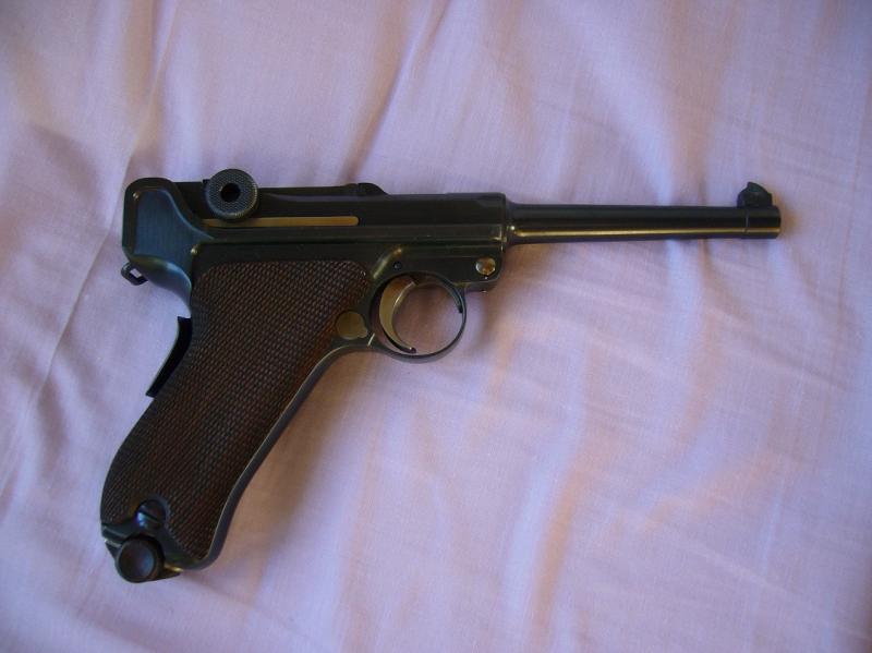 Buenas tardes a todos. Por mi parte voy a mostrar una "Luger" de las mías. Es una P-06 en calibre 7,65 parabellum y creo que no tiene tanta "historia" como otras ilustres protagonistas que se han asomado por aquí. Lleva marcada la corredera con "DWM" y en el frente, bajo el cañón, el número "9100" repitiéndose las dos últimas cifras, "00" en alguna pieza, pero nada más