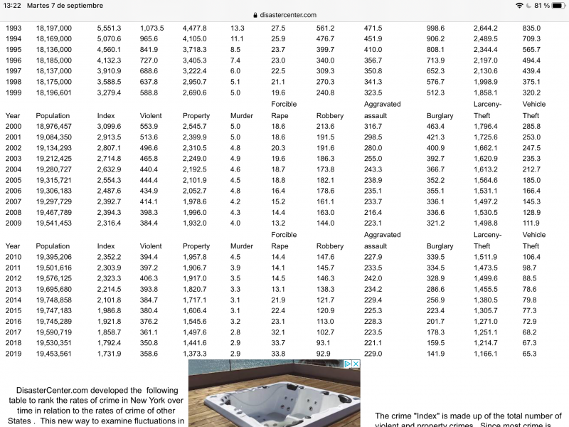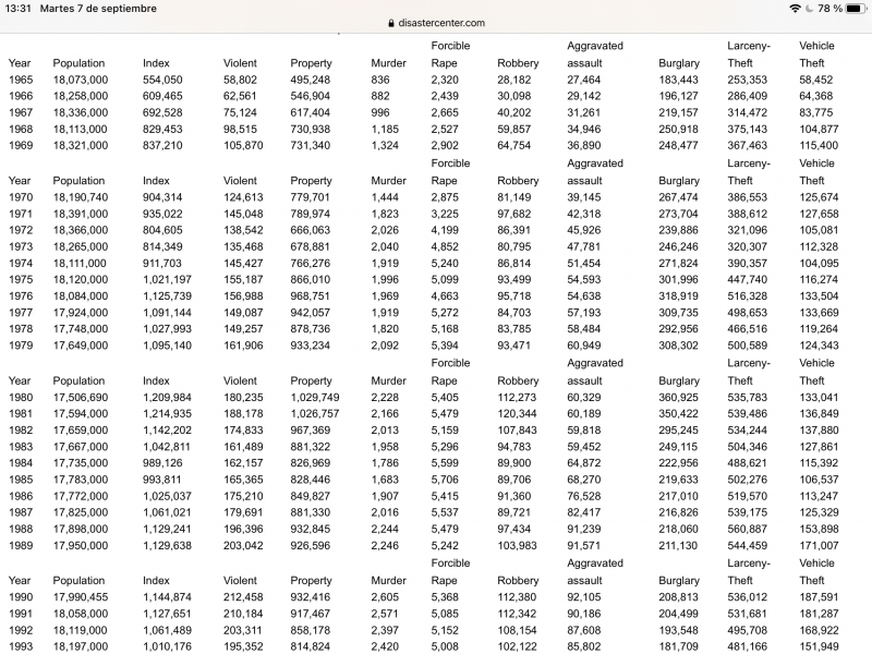 Tendriamos asi que para unos 18 millones de hab, en 1965 en NYC hubo 836 asesinatos, 2320 agresiones sexuales, y 27,464 asaltos a mano armada.....cifras que dada año van aumentando en forma exponencial hasta 1993, donde con misma poblacion, 18 millones de hab se triplica el numero de asesinatos, casi 2400, mas que se dobla el de violaciones, 5003, y triplica el de asaltos a mano armada, mas de 80,000.