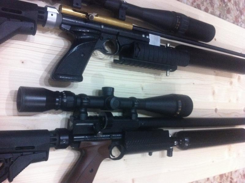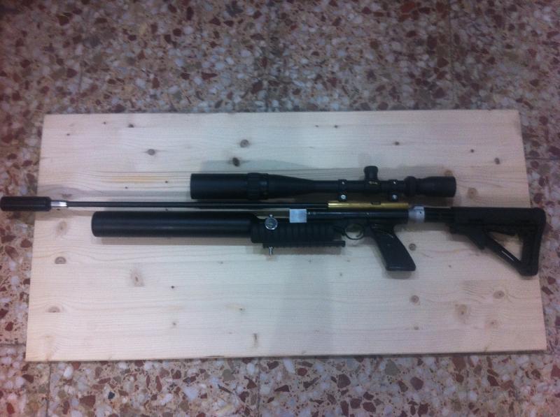 pues asi quedo la ultima crosman, cambie el deposito de 200 cc por uno de 400 cc , cambie el culatin squeleton de aluminio por una culata extensible tipo m4 con adaptador tipmman home made y asi ha quedado