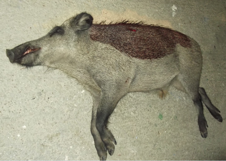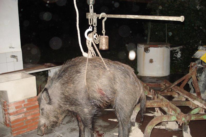 en la foto no se aprecia el tamaño del animal, bascula no tengo, pero si tenia a mano a un compañero que yeva cazando jabalis mas de 20 años y le estimo ese peso. de hecho vino conmigo a cargarlo porqye ami aolo me fue imposible arrastrarlo y aun fue necesario otra persona mas para echarlo al maletero.