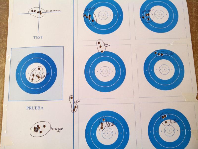 Pues creo que ya he dado con la carga. He hecho pruebas hoy con 41, 42, 43, 44, 45 y 46 grains y con cada una iba agrupando mejor y mejor, hasta que con 46 los tiros entraban uno sobre otro. Aquí pongo unas fotos de las dos agrupaciones que hecho con 46gn, con dos puntas diferentes. Se ve las que son en las anotaciones en las fotos.