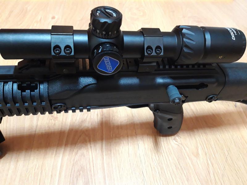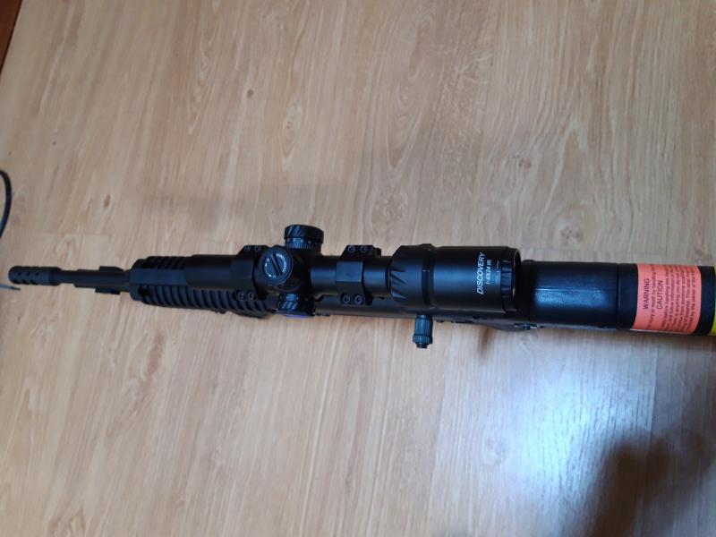Le he puesto una empuñadura retráctil, punto rojo laser bajo el cañón, freno de boca, que por cierto tengo 2 más por si a alguien le interesan, le he eliminado los elementos de puntería que traía de fábrica y le he colocado un visor de batida marca Discovery modelo 1-6x26 HD con retícula iluminada, que por cierto me han parado en la aduana y me tocado pagar suplemento.