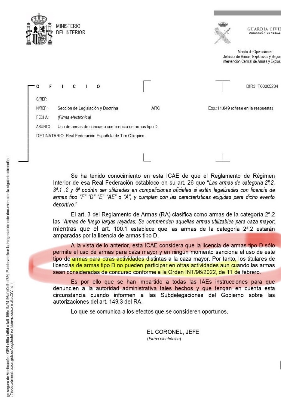 Esta situación, de la que es responsable una interpretación extremista, radical, del Reglamento de Armas por parte de la Guardia Civil, ya me parece más que lamentable, bochornosa. Que una Real Federación, que es un ente de derecho privado pero que ejerce funciones públicas, tenga que hacer ese comunicado al ser perjudicada de tal forma por una Administración, es algo inaudito.