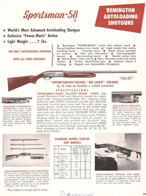 La Remington modelo 58 obtendrá una buena acogida por parte de los aficionados vendiéndose 271.000 unidades hasta el cese de su producción en 1963, un notable éxito para esta bella escopeta que es la primera de acción por gases de la compañía.