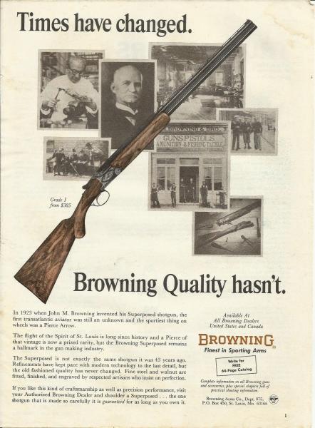 Browning es lo mas para los aficionados, por si esto fuera poco, el mundo de la competición deportiva descubre asombrada como el ultimo legado, la Browning superposed, un arma que debido a la gran depresión y a la 2ª guerra mundial había pasado desapercibida para el gran público aficionado al tiro deportivo, emerge como si viniera del mas allá como la gran obra póstuma de John, la mejor superpuesta de todos los tiempos y referencia desde su nacimiento asombra a propios y extraños sentando las bases de lo que son nuestras modernas superpuestas de hoy en día, es la última clase del gran Maestro mas de 25 años después de su muerte.