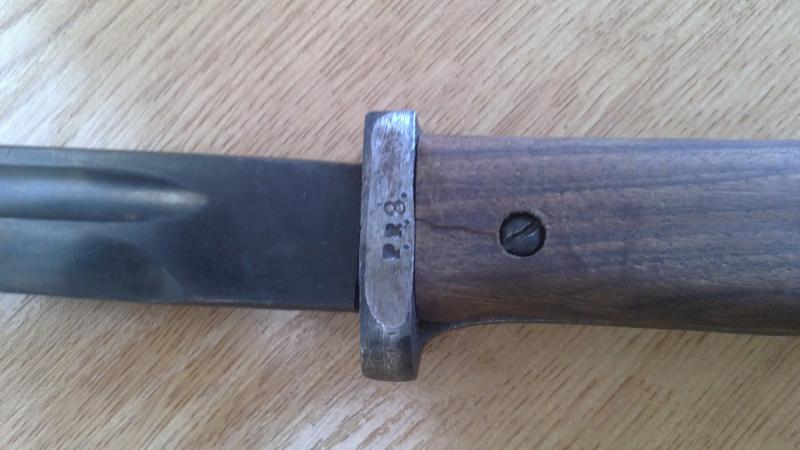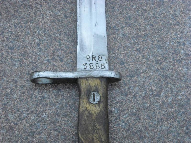 Beltran mira esta foto con el marcaje P.R.8, esta parece ser una del mosquetón 1916, ¿será que las empuñaduras las marcarón antes de soldarle la hoja como comentas?.