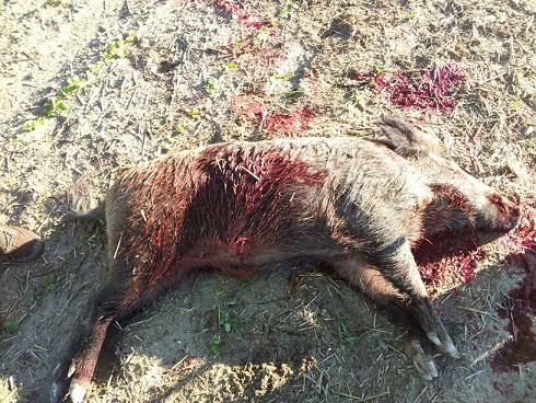 Primer tiro me lo dejo atras, segundo tiro le doy en una pata trasera como corria el condenado y el tercero en su sitio bien colocadito y planchado; por cierto no hubo orificio de salida.