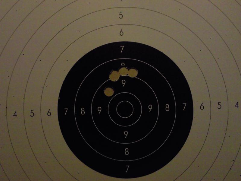 Prácticamente idéntica agrupación pero ligeramente mas alta, la carga era un pedo de mosca pero agrupar agrupa, para lesionarme el hombro debería de tirar unos 2000 tiros o mas parecía un .22.
