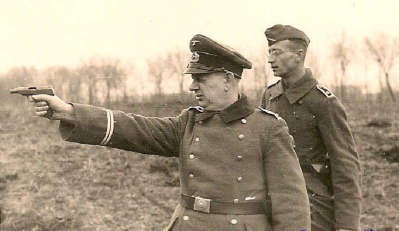 la pistola que dispara el oficial , creo ver que es una Walther Numero 4 del 7,65