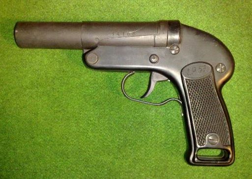 La pistola lanzabengalas es esta, no le veía ni la falta de guardamonte ni el martillo percutor...pero no se como se llama