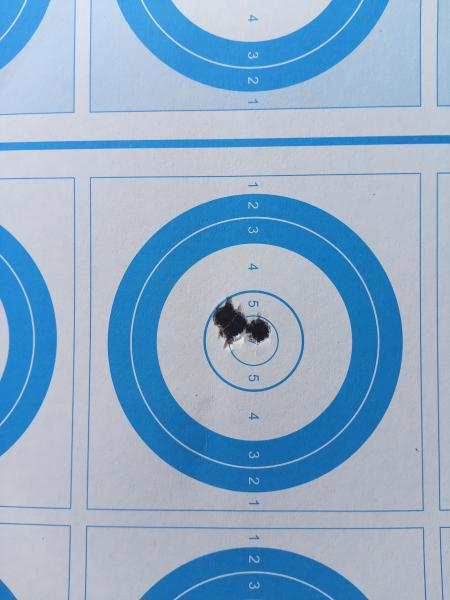 Dos tiros él y uno yo a escasos 80 mts apoyados en una piedra plana usando mochila. Blanco casero, un folio DinA 4 con una cruz pintada para poner la Cruz del visor en ella.Los tres cosidos uno al otro sin hacer cacahuetes, unos 4 CMS altos sin ninguna deriva, así que está perfecto, falló el indio.