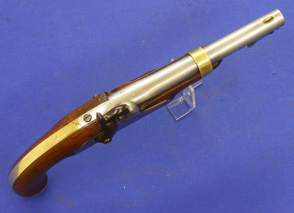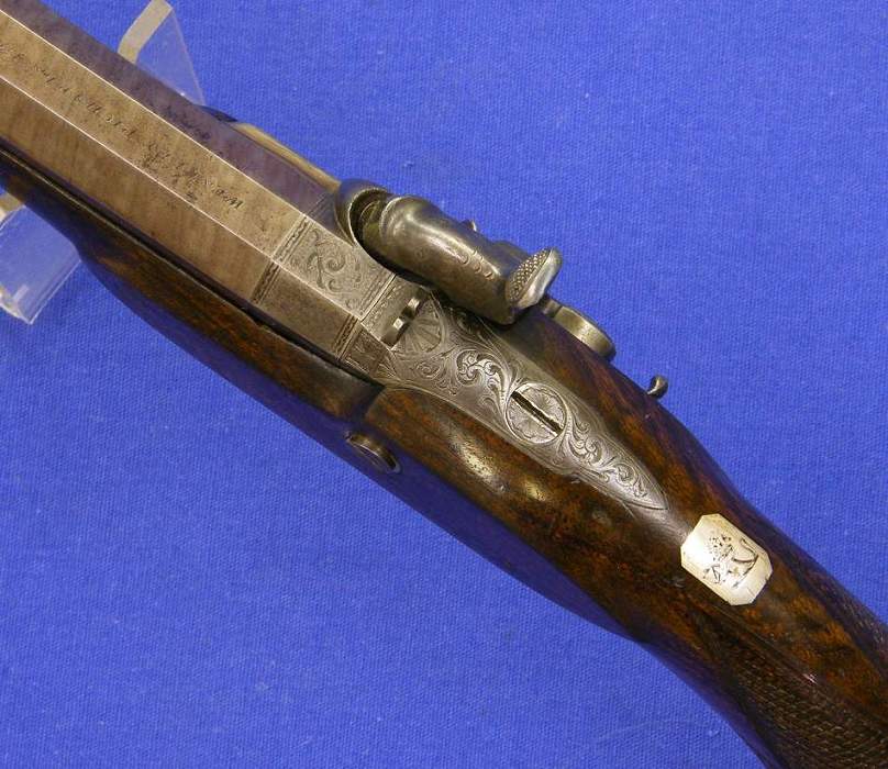 Un preciosa pistola inglesa de percusion por Westley Richars, en el 170 de New Bondstreet Londres, calibre 14 mm. Longitud 26 cm. En perfecto estado.