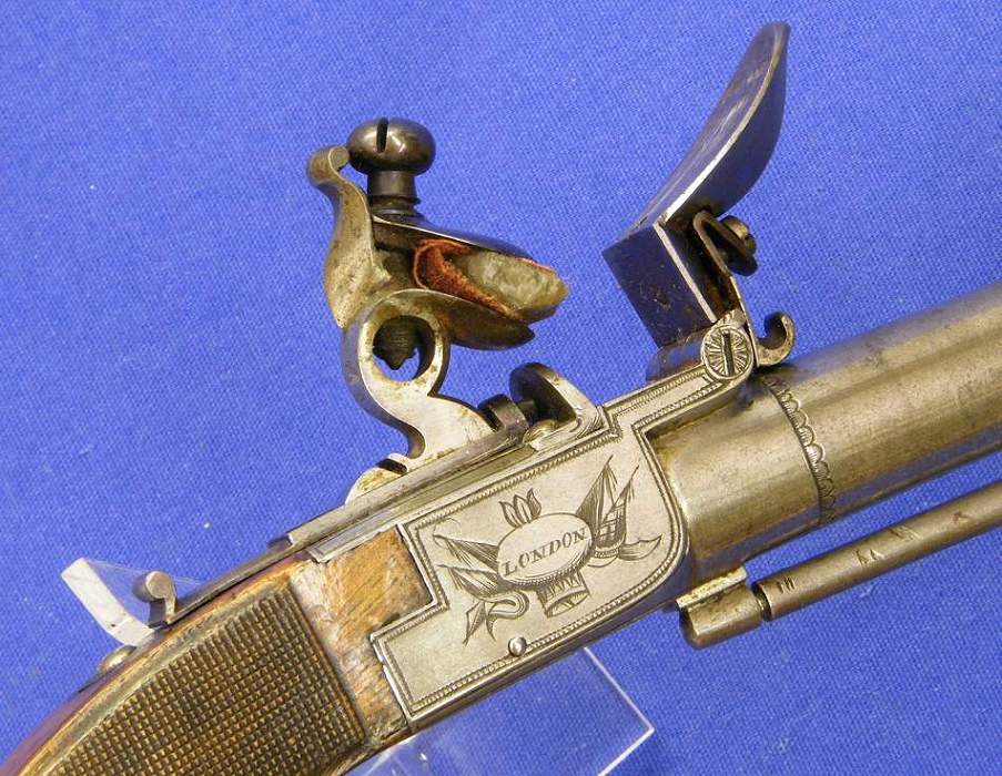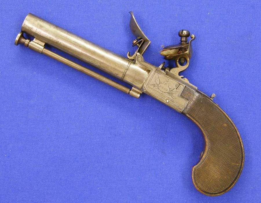 Una bella y de alta calidad pistola de silex inglesa de bolsillo fabricada por P. Bond de Londres, sobre el año 1800, calibre 13 mm. Longitud 22,5 cm. En perfecto estado,