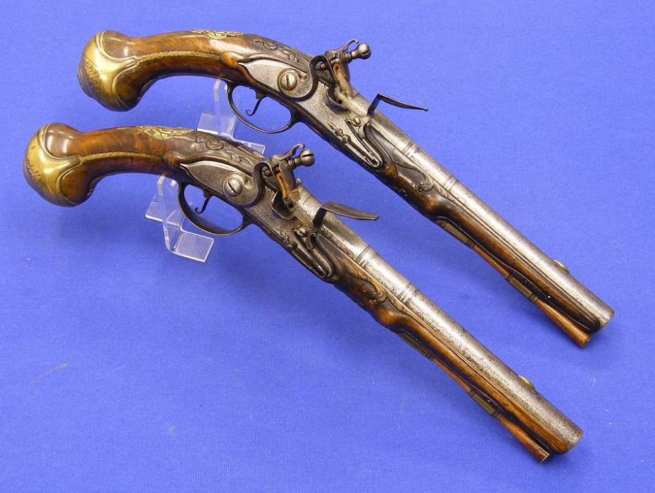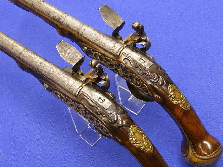 Bella pareja de pistolas holandesas de silex por Penterman de Utrecht, sobre 1720, longitud de 42 cm. Calibre 16 mm. En muy buen estado,