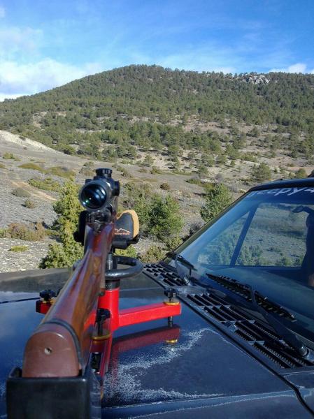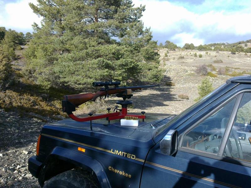 De modo que aquí estamos de nuevo: rifle, munición, visor, cañón limpito pero menos, día con viento racheado (que procuro dejar a mi espalda). Distancia de tiro 150 metros, banco de tiro montado de forma chunga, cómo no, encima del Jeep. El resultado fue bastante mejor que en ocasiones anteriores, si bien creo que aún quedan residuos de cobre en el cañón. También creo que a mi rifle no le gustan las peladillas de 180 grains, ya contaré cómo va cuando pueda probar las Hornady SST de 165, pero de momento no bajo de 1,5 MOA. Bueno para cazar, desde luego, pero esperaba más.