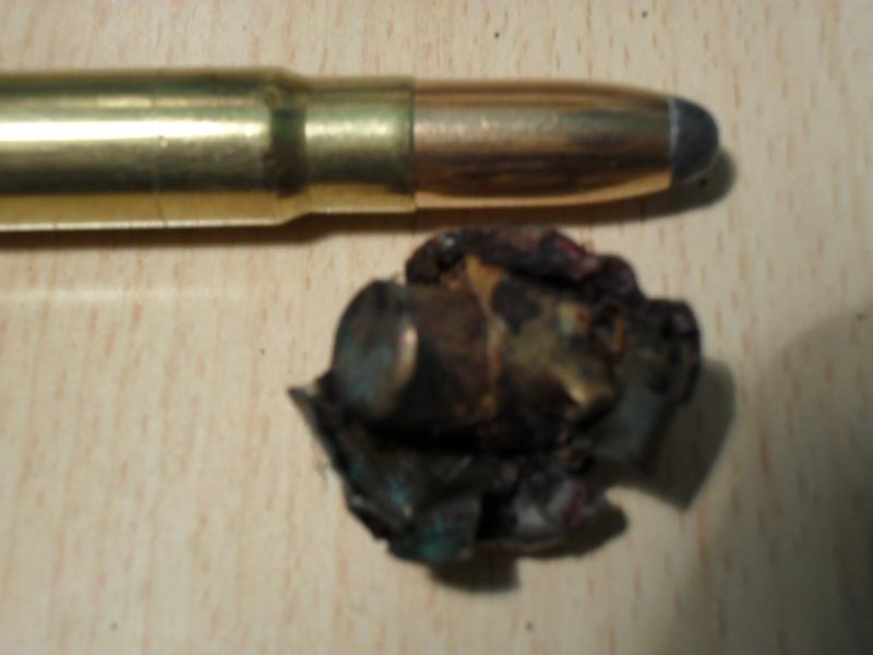 El 9,3 x 62 recargado va de maravilla, os pongo unas fotos de un proyectil recuperado de un jabalí de 87 kg. al que disparé desde detrás huyendo . El tiro en el mismo eje del animal le atravesó todo el cuerpo quedando justo en la piel del cuello, por lo que transfirió toda la energia. Todavia recorrió unos 200m. antes de echarse. por dentro era todo una papilla.
